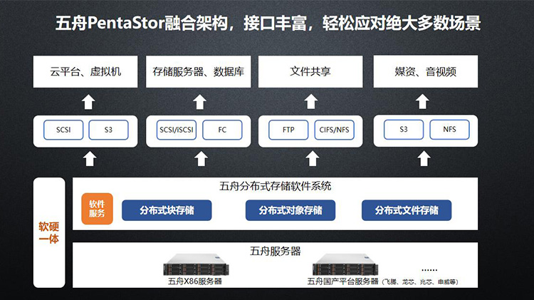 五舟分布式存储系统PentaStor是一个为海量数据共享而设计的集群存储系统。存储系统由工业标准的通用硬件和PentaStor软件构成,同时提供块、对象和文件的统一存储,具备磁盘、节点、网络、机架及数据中心等修复自愈自治能力;适用于数据密集型应用,能够支持政府、大型集团企业、运营商等客户实现PB级容量的存储资源池,为客户提供高性能、高可靠、易管理的数据存储服务。