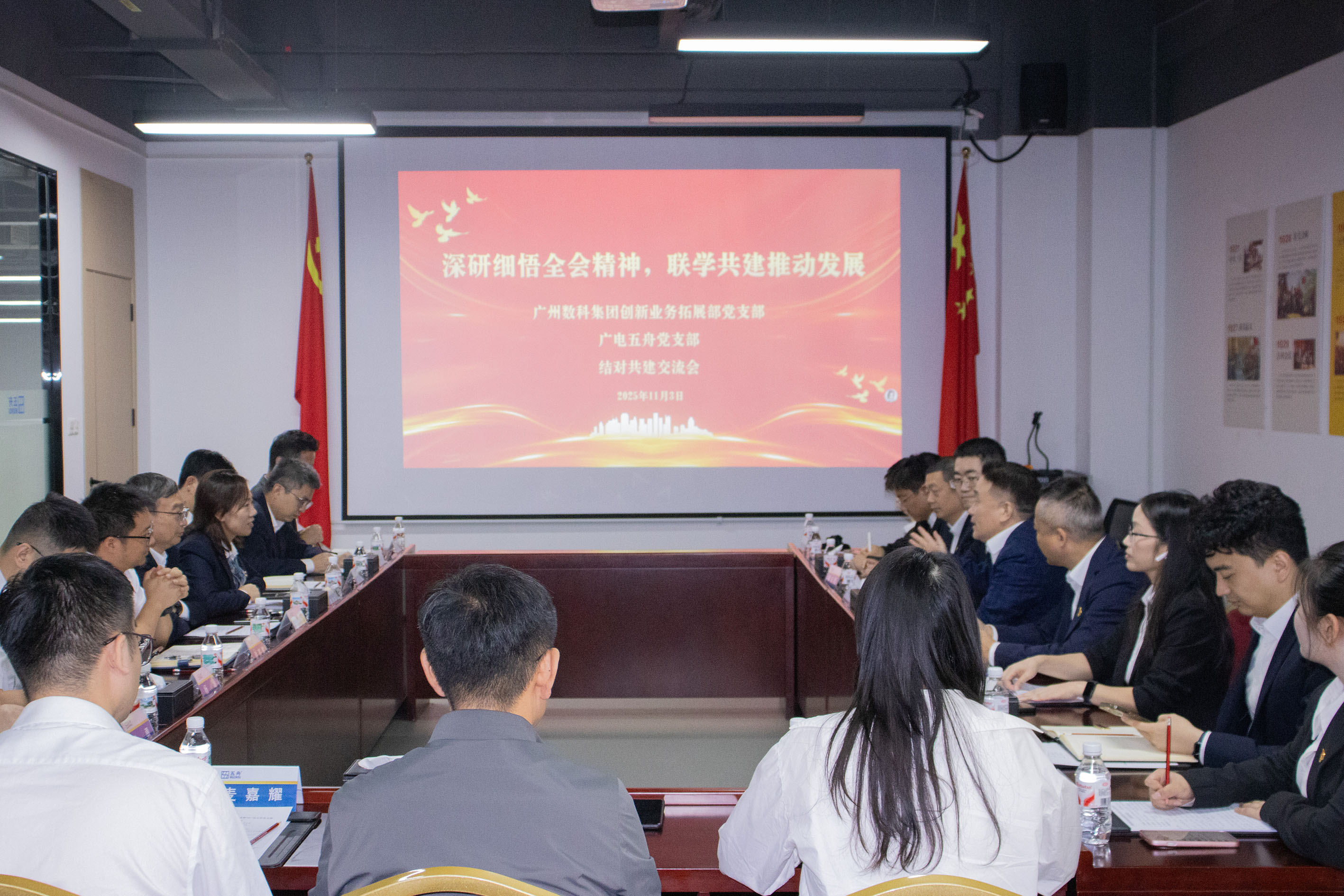 为深入学习贯彻党的二十届四中全会精神,推动党建工作与业务发展同频共振,11月3日,广电五舟党支部与广州数科集团创新业务拓展部党支部联合开展“深研细悟全会精神,联学共建推动发展”结对共建活动。广州数科集团创新业务拓展部党支部书记、智慧城市首席运营官徐宝民,广电运通党委副书记、纪委书记谢臣,广电五舟党支部书记、董事长廖海英,广电五舟党支部副书记、总经理谢高辉,以及双方约20余名党员代表共同参与,以学促建、以建促干,凝聚起高质量发展的红色合力。