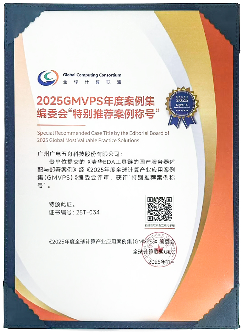 近日,由全球计算联盟(GCC)主办的2025全球计算大会(CGC2025)在深圳举行。会上,GCC重磅发布《2025年度全球计算产业应用案例集(GMVPS)》(简称“GMVPS”),广电五舟《清华EDA工具链的国产服务器适配与部署案例》,从全球前沿应用的年度申报案例中脱颖而出,最终获评GMVPS编委会“特别推荐案例”称号。