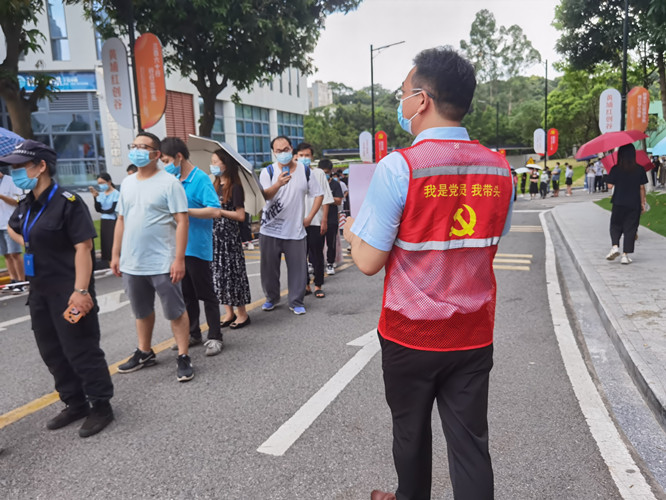 五舟党员志愿者们顶着烈日指引现场人员扫码登记信息,开展维持秩序、指引检测等工作,协助现场人员有序地分批完成核酸检测工作,本次共助力园区完成8000多人数核酸检测。
