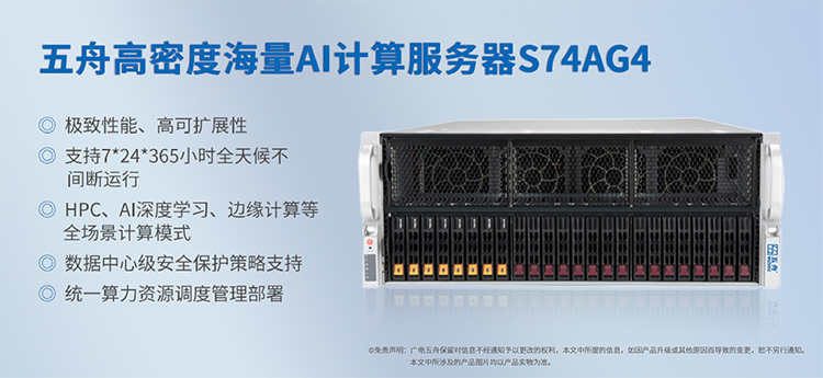 五舟高密度海量AI计算服务器S74AG4同时具备高可扩展性、高兼容性、高密度及高稳定性等特性,将高性能计算与能耗控制做到完美的均衡。