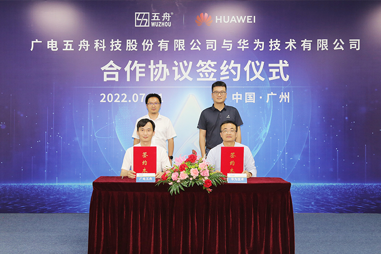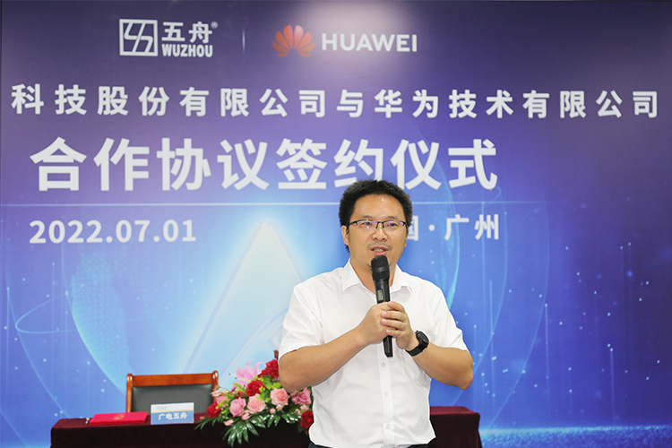 广电五舟副总裁梁志伟、华为昇腾计算整机伙伴业务总经理胡宣春代表双方进行签约,广电五舟总裁谢高辉、华为昇腾计算业务总裁张迪煊等出席仪式并见证签约。