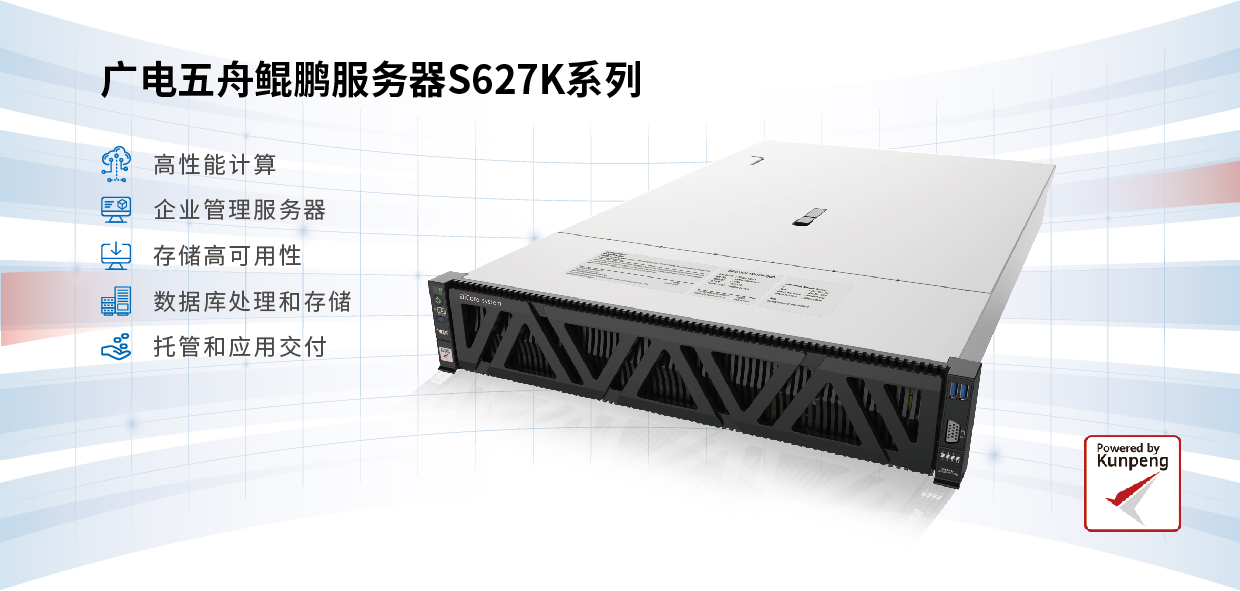 广电五舟鲲鹏服务器S627K系列是广电五舟的明星产品之一,该系列是搭载了鲲鹏920处理器的高性价比服务器产品。凭借领先的架构和高可靠性的解决方案,在计算能力、存储空间、运维效率和可靠性等方面都达到了行业领先水平,能给用户带来高端的产品效能,是一款为用户量身打造的服务器平台。