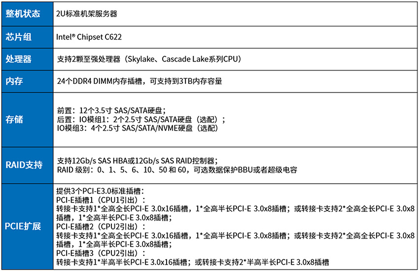 支持intel 高主频、多核Cascade Lake系列处理器(如:28核,2.70 GHz),12个内存通道,内存频率2933MHz,单条最大内存容量支持到128GB,最大内存容量可到3TB;
