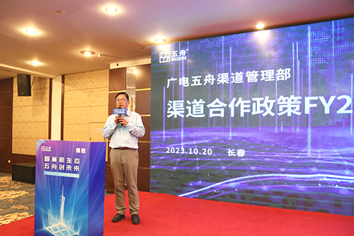 广电五舟渠道管理部总经理顾庆强调了渠道的重要性,并详细介绍了五舟渠道的体系架构和支持政策,明确各层级代理商的责任义务,希望加强与渠道伙伴的业务关系,未来展开深度合作。