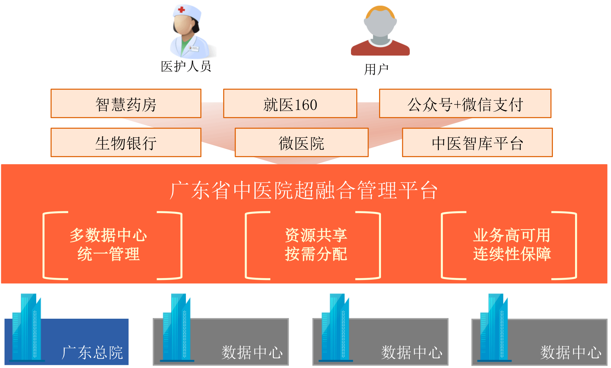 打通医疗业务协同窗口,开启智慧医疗新模式,建立超融合管理平台实现多数据中心统一管理,资源共享按需分配,保障业务高可用连续性。分区域建设,集约化管理,实现区域化管理下的信息互联。