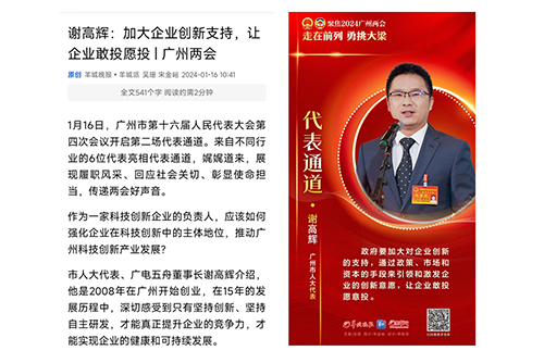 1月15日上午,广州市第十六届人民代表大会第四次会议(以下简称:广州两会)在白云国际会议中心拉开帷幕。1月16日,广电五舟董事长谢高辉作为一名来自民营企业的市人大代表走上了“代表通道”,就如何强化企业在科技创新中的主体地位、推动广州产业高质量发展提出建议,并受到南方日报、羊城晚报、广州日报、南方财经、新快报、南方新闻网等在内的多家国内主流媒体的关注报道。