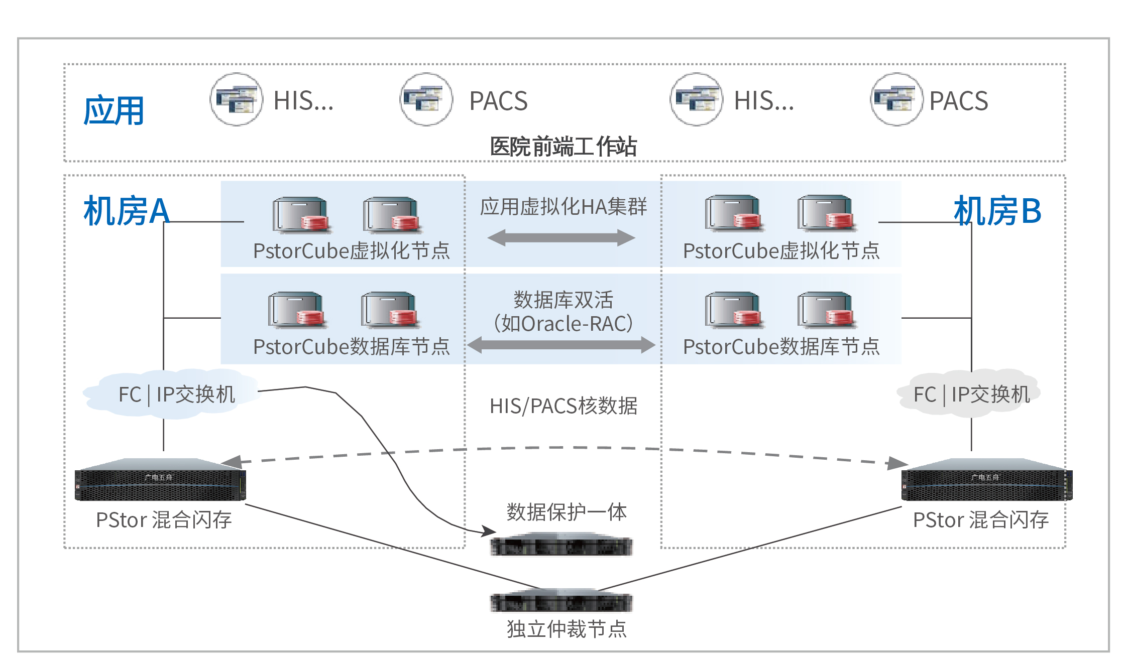 在与民生息息相关的医疗行业,广电五舟考虑到传统IT基础设施难以确保医院系统的稳定性和可靠性,因而基于广电五舟PstorCube超融合一体机等高效算力和存储产品,构建了适用于地市级医院的双活数据中心解决方案。