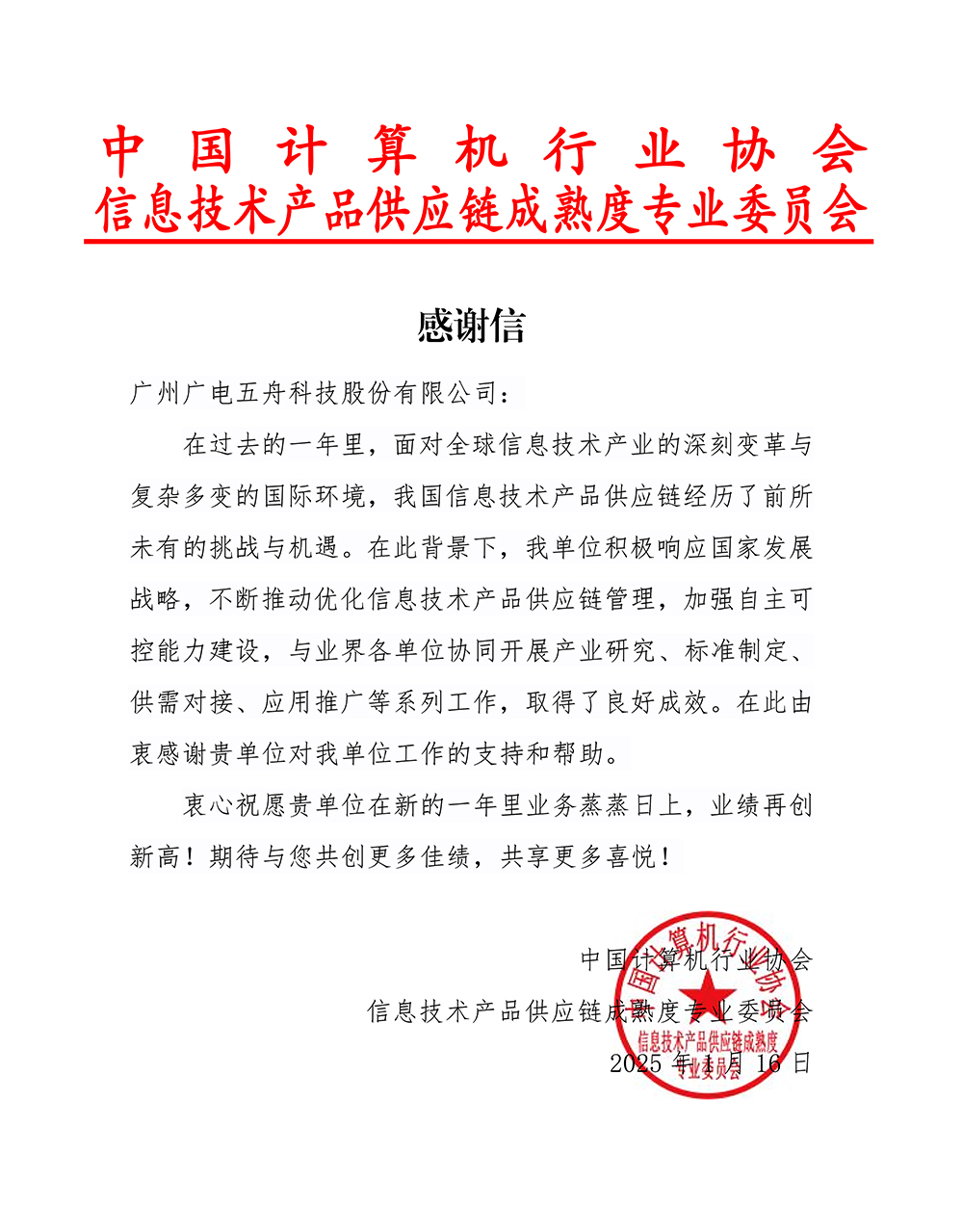 新春之际,广电五舟收到中国计算机行业协会信息技术产品供应链成熟度专业委员会(简称“供应链专委会”)的感谢信,信中对广电五舟在2024年参与信息技术产品供应链管理发展及标准制定方面的贡献表示感谢,并表达了对未来双方深化合作的期待。