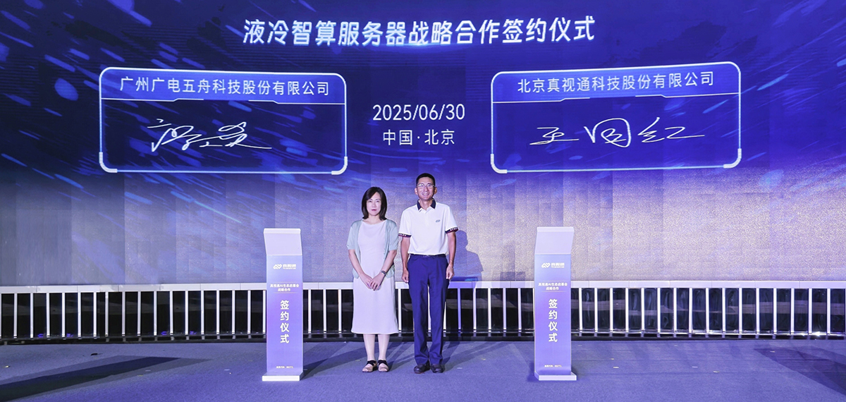 在大会现场,广电五舟董事长廖海英与真视通董事长王国红完成战略合作签约。双方将围绕GPU芯片与服务器散热产品的联合研发、市场拓展与品牌共建三大方向展开深度协同,旨在打造更具竞争力的绿色算力生态体系。