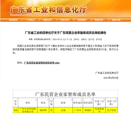 近日,广东省工业和信息化厅启动广东民营企业家智库成员的申报推荐工作,经企业家申报、地级以上市工业和信息化局及省有关商协会推荐,省工业和信息化厅组织资格审核等缜密考察、严格评审,五舟科技总裁谢高辉成功入选“广东民营企业家智库成员”。本次共有272位民营企业家入选智库,谢高辉总裁与其他入选企业家将积极为提升广东省民营经济发展工作的科学化水平建言献策,发挥在各自领域的示范引领作用,助力民营经济高质量发展。