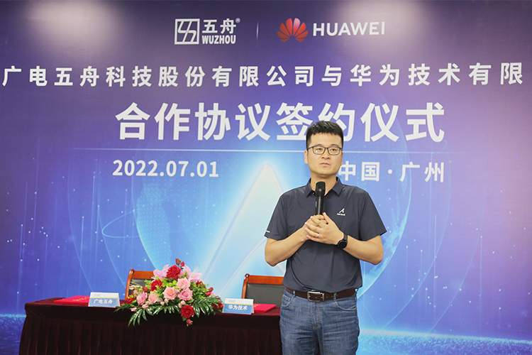 广电五舟副总裁梁志伟、华为昇腾计算整机伙伴业务总经理胡宣春代表双方进行签约,广电五舟总裁谢高辉、华为昇腾计算业务总裁张迪煊等出席仪式并见证签约。