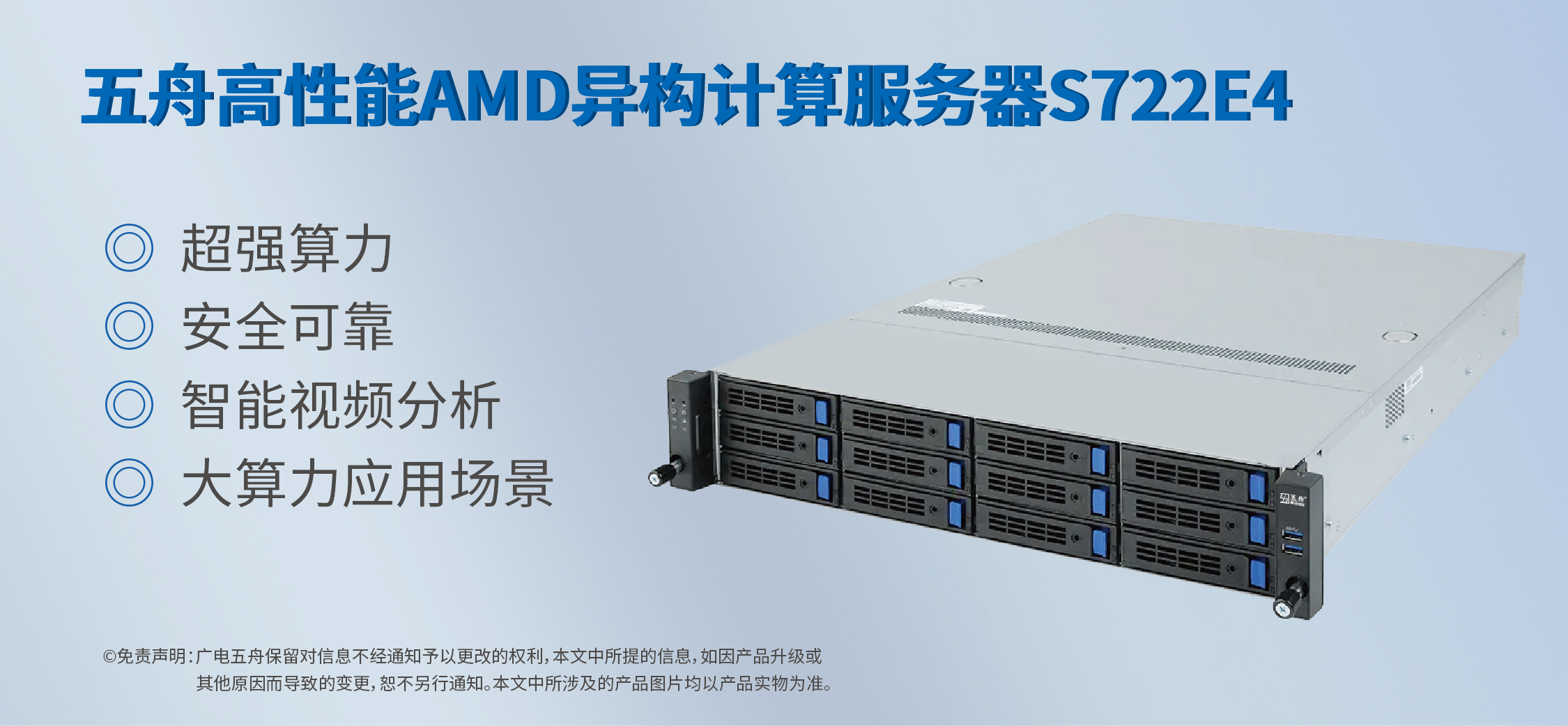 本项目所采用的五舟高性能计算服务器S722E4,能以更低的功耗实现更密集的计算能力,提供可观的计算、IO 和带宽能力;支持3片AMD 、Nvidia 、Xilinx、高通专业异构加速卡,峰值单精度浮点速度高达每秒19.5 TFLOPS次浮点计算能力,除了高性能计算外还能满足大数据分析、深度学习和云计算等应用的计算需求。