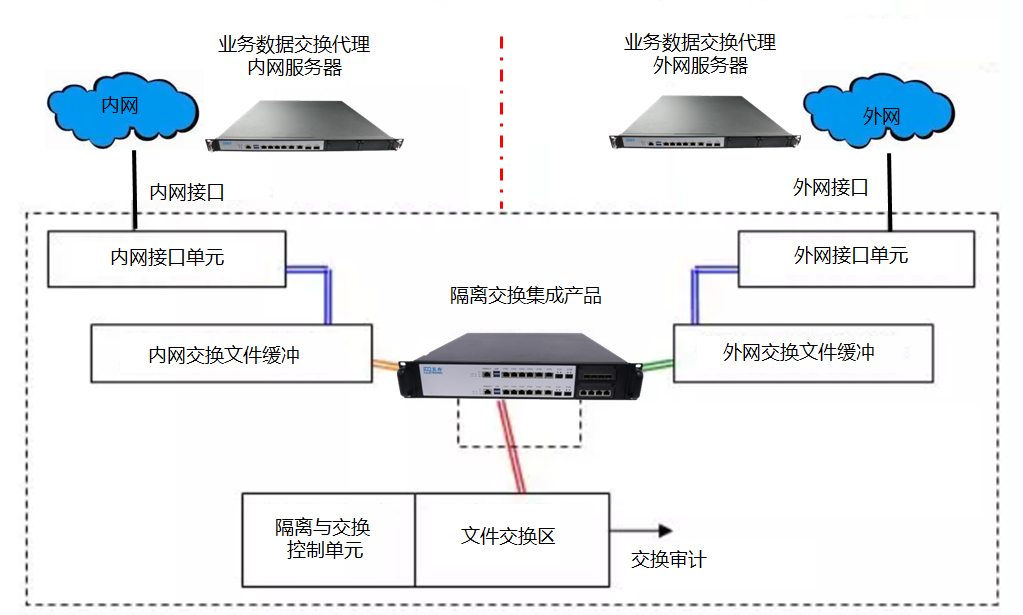 网闸是一种利用固态开关读写介质连接两个独立网络系统的信息安全设备,可以在物理层实现对内、外网的隔离和控制,防止网络攻击和信息泄露。其在保证业务通讯隔离的基础上,实现了数据交换,而关键则是安全性的延续,所以网闸的设计重点不仅在隔离与交换的控制逻辑设计上,还包括业务代理的实现模式上。通过网闻实现业务数据自动交换的原理模型如下: