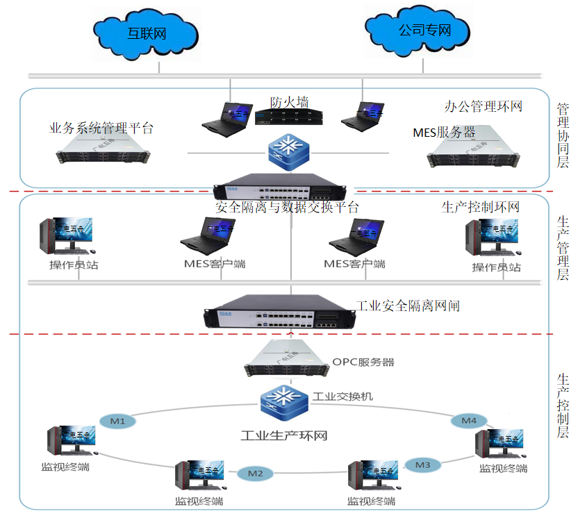 以下为广电五舟网闸(硬件)联合系统集成开发的安全隔离与信息单向导入系统产品,在企业生产部署应用框图,以及广电五舟飞腾网闸明星产品NF-3212。