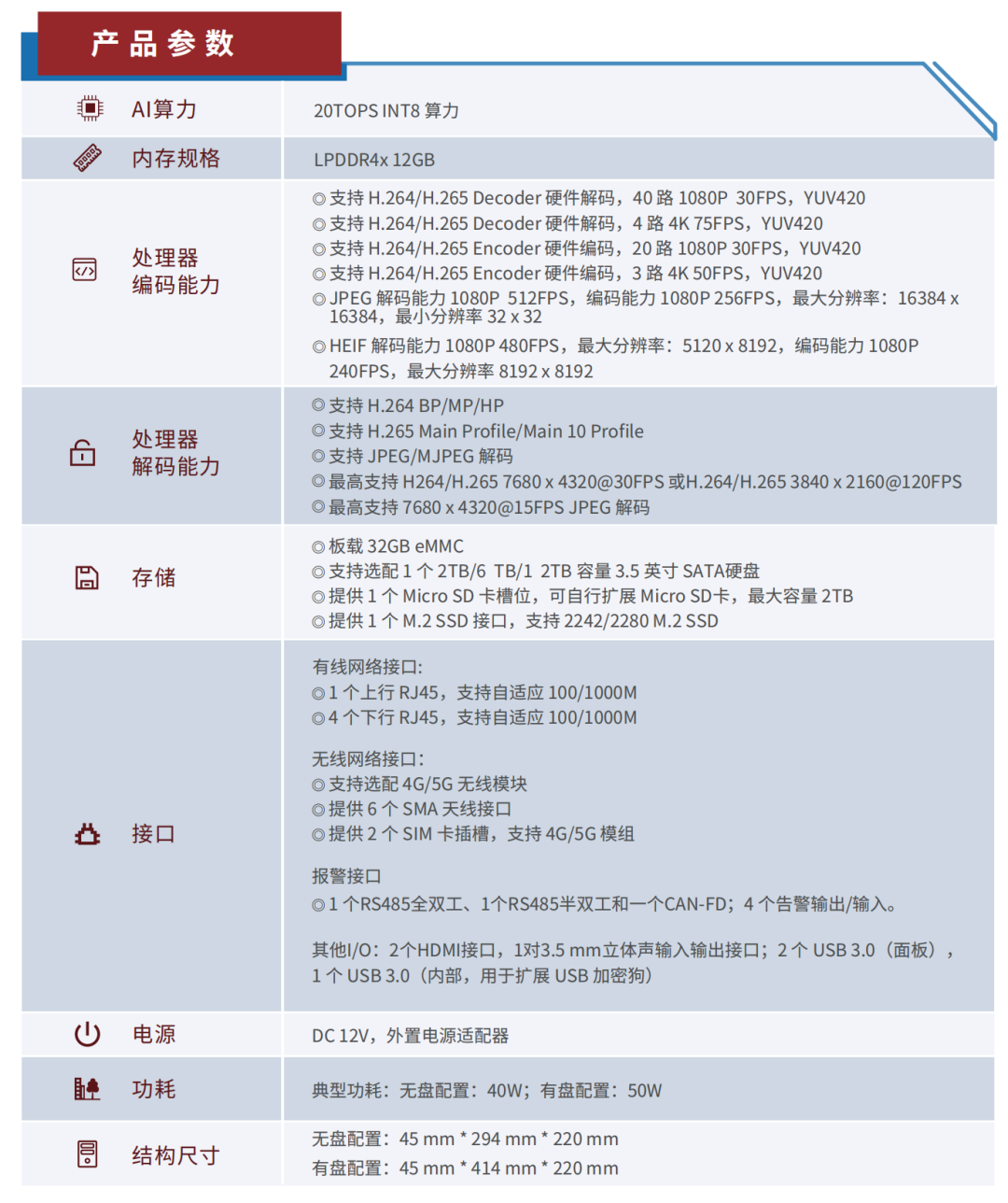 广电五舟智能小站S500I2是业界领先集成AI处理能力的边缘产品,最大支持40路高清视频处理能力,具备超强计算性能、大容量存储、配置灵活、体积小、支持温度范围宽、环境适应性强、易于维护和支持云边协同等特点,可以在边缘环境广泛部署,满足在安防、交通、社区、园区、商场、超市等复杂环境区域的应用需求。