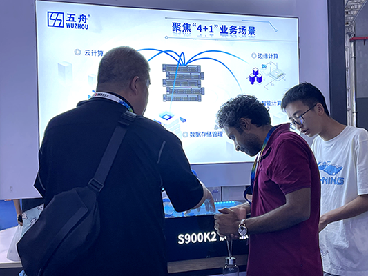 本次广电五舟在W2数字产业馆展出了“广电五舟推理服务器S800K2、广电五舟训练服务器S900K2、广电五舟智能边缘服务器S500K2、广电五舟青松台式机S198K1”四个重磅智算产品,吸引众多国内外参会嘉宾驻足了解咨询。