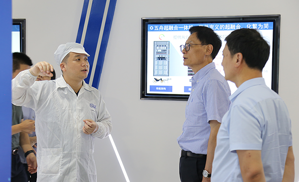 罗勇为赵立群等领导讲述广电五舟的业务板块与产品布局。广电五舟深耕算力领域,把握服务器“国产化、差异化定制、软硬一体化”三大核心要素,围绕高性能计算、云计算、边缘计算、智能计算等业务领域,不断推出新型国产智能算力产品、存储产品与行业解决方案,相关产品与解决方案已广泛应用于政府、教育科研、安平、金融、网络安全、人工智能、互联网等行业及领域。