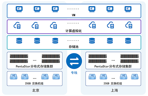 “数据双活”架构为两地数据中心分别部署一套分布式存储集群,单套集群内进行本地数据的读、写、用,两地数据中心之间用专线连接,进行数据交换,互为备份,保障数据在架构上的安全性。