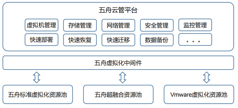 完成部署后,数据中心可同时纳管Vmware和五舟虚拟化并管理异构资源环境,大大降低了运维成本,简化了管理环节,提升了运维效率,节省了成本。