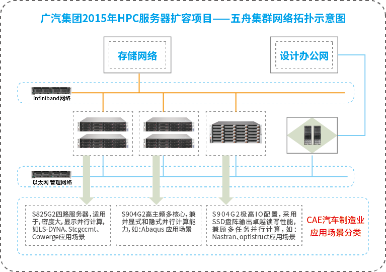 针对广汽实际场景,本项目采用广电五舟高密度产品五舟2U双路机架服务器(高密度)S904G2系列五台,超算服务工作站五舟2U四路机架服务器S825G2两台,集群共计720个计算核心,达到了20万亿次/秒的实际浮点算力。
