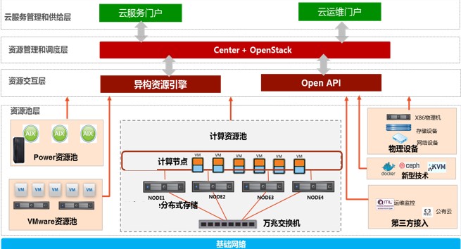 整体架构设计分为四层:云服务管理和供给层,通过五舟云管理服务平台提供相关云资源的服务交付和运维管理;资源管理和调度层,通过对接下层服务器虚拟化管理平台,以及OpenStack相关组件,实现云服务需求的调度和任务下发;资源交互层,通过五舟异构管理组件WCE,OpenStack相关API接口,第三方API接口,实现对资源池层的交互对接;资源池层,包括本次重点建设的计算资源池、小型机资源池、原有的资源池纳管、物理设备统一纳管、未来可融合如容器、大数据技术等建设内容。