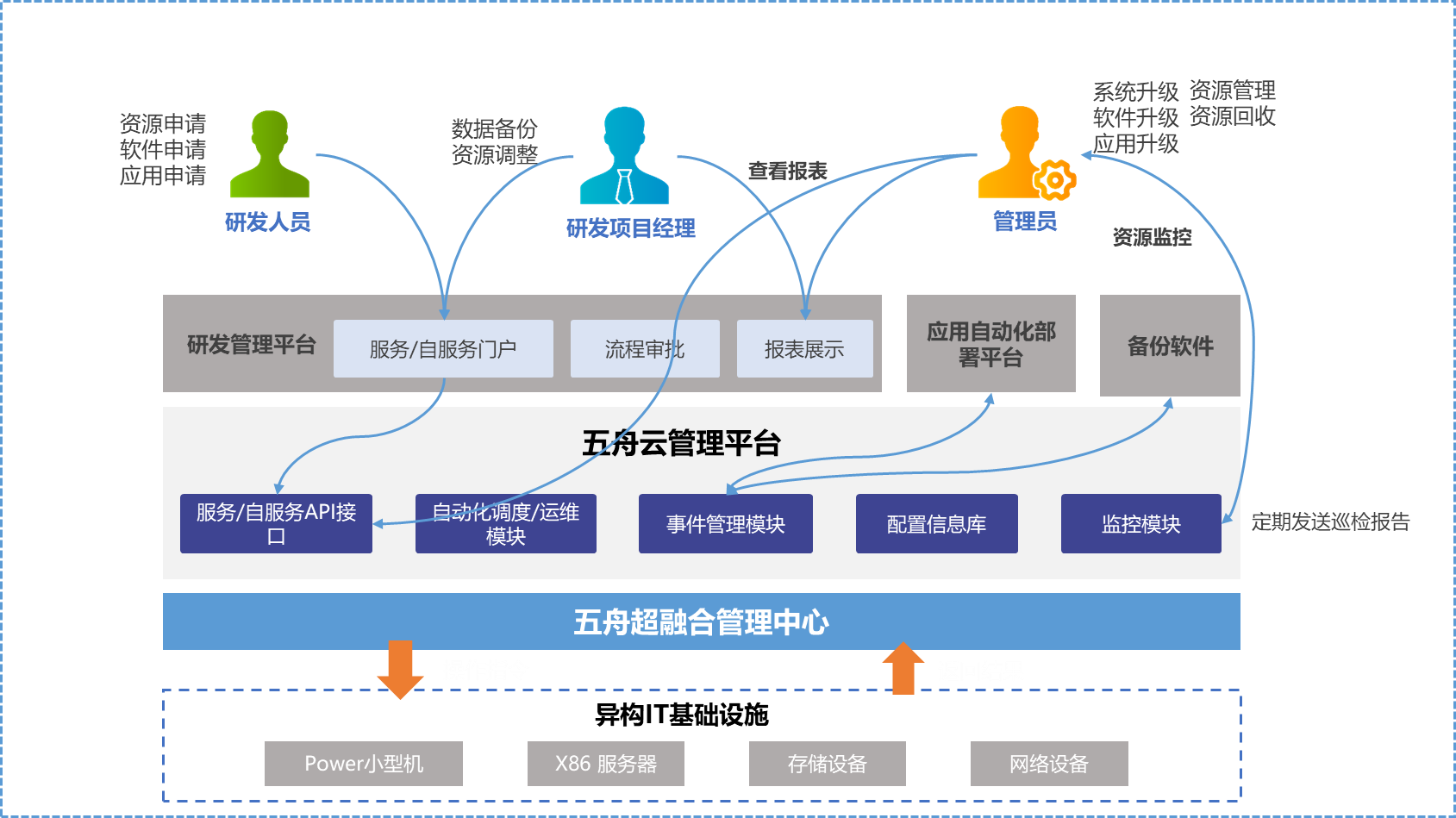 为了解决目前客户数据中心面临的问题,五舟在支行数据中心采用云计算的IT基础架构,通过硬件设备虚拟化、软件版本标准化、系统管理自动化和服务流程一体化等手段,将IT设备提供的计算能力、通信能力、存储能力封装成资源池,建设一个以服务为中心的云计算运行平台,把资源的使用方式从专有独占方式转变成资源池化的共享方式,运行环境可以自动部署和调整资源分配,实现资源按需分配,从而建立一个基于业务的资源共享、服务集中和自动化的云计算平台。云计算平台总体架构如下: