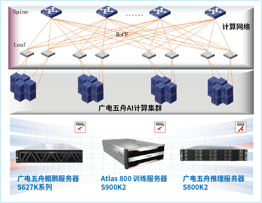 广电五舟提供了广电五舟基于鲲鹏920+昇腾910芯片设计的S900K2训练服务器以及搭载昇腾推理卡的广电五舟S800K2推理服务器,配合广电五舟S627K2鲲鹏服务器形成强算力密度,高能效与高速网络带宽的AI算力集群解决方案,形成初具规模的AI算力集群,为本土企业提供低延时高效的AI算力服务,助力大湾区AI智能算力基础建设,赋能人工智能与各行业的深度融合,交互发展。